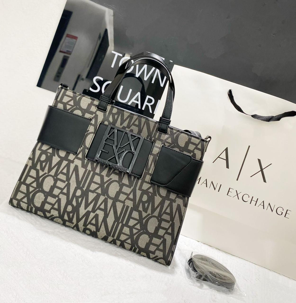 Armani Exchange (A|X) tote bag featuring an all-over, repeating logo print in black and beige. The bag has short black top handles and a vertical black band across the center, which is adorned with a prominent, cut-out black rubber or plastic A|X logo patch and two solid black patches on either side. It is shown with a detachable shoulder strap and an Armani Exchange