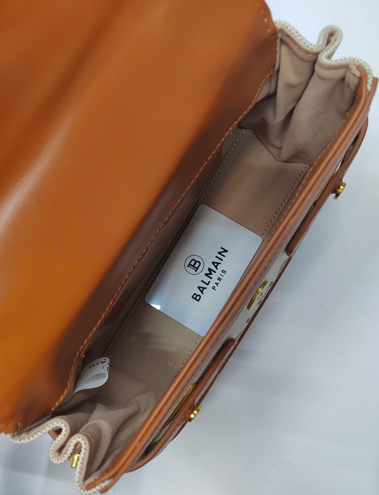 The structured Balmain B-Buzz bag in sleek Brown leather, featuring a top-handle silhouette and a striking oversized gold 'B' turn-lock clasp.