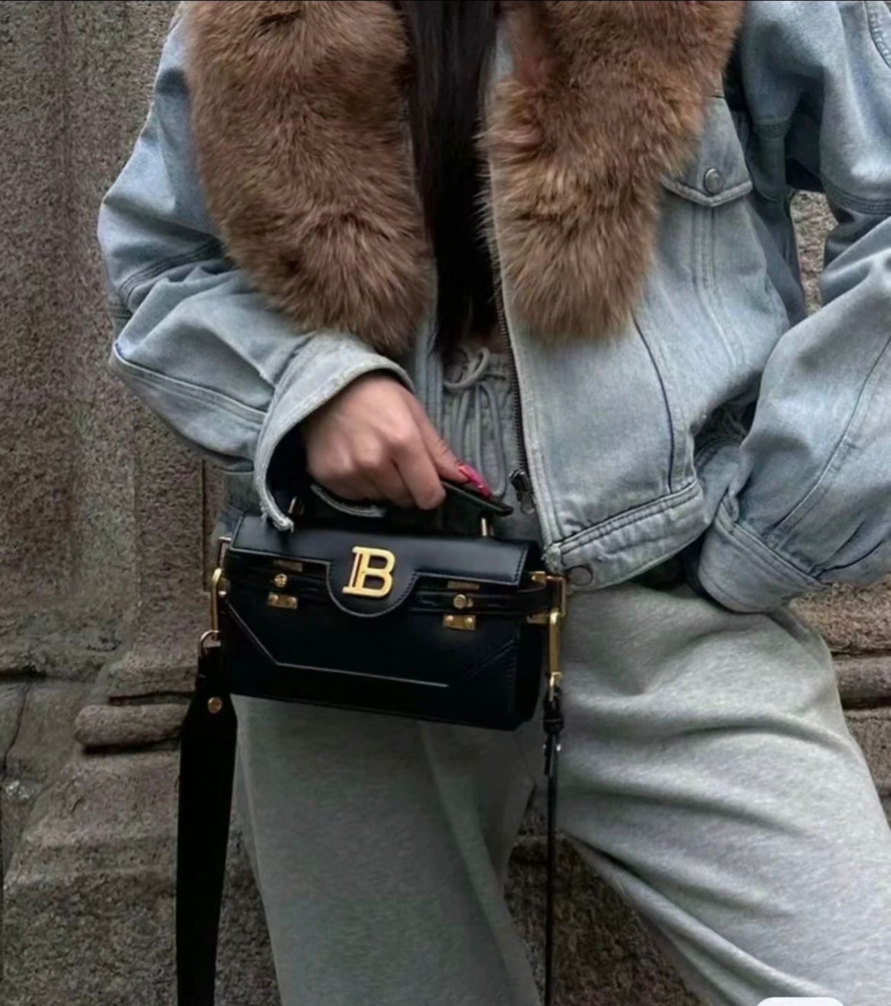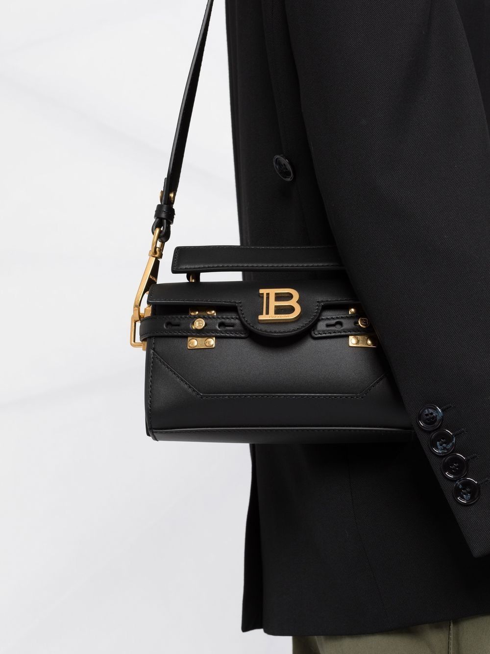 Balmain B-Buzz bag in black leather, featuring an elegant top-handle design and a striking oversized gold 'B' turn-lock clasp.