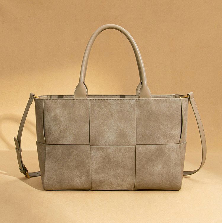 This is a medium-sized Bottega Veneta tote bag, characterized by its signature Intrecciato-like woven or paneled design, constructed from large, rectangular sections of material. It features two sturdy top handles and a detachable, adjustable shoulder strap, offering versatile carrying options. The bag's structure appears soft yet retains its form, and its solid, neutral tone
