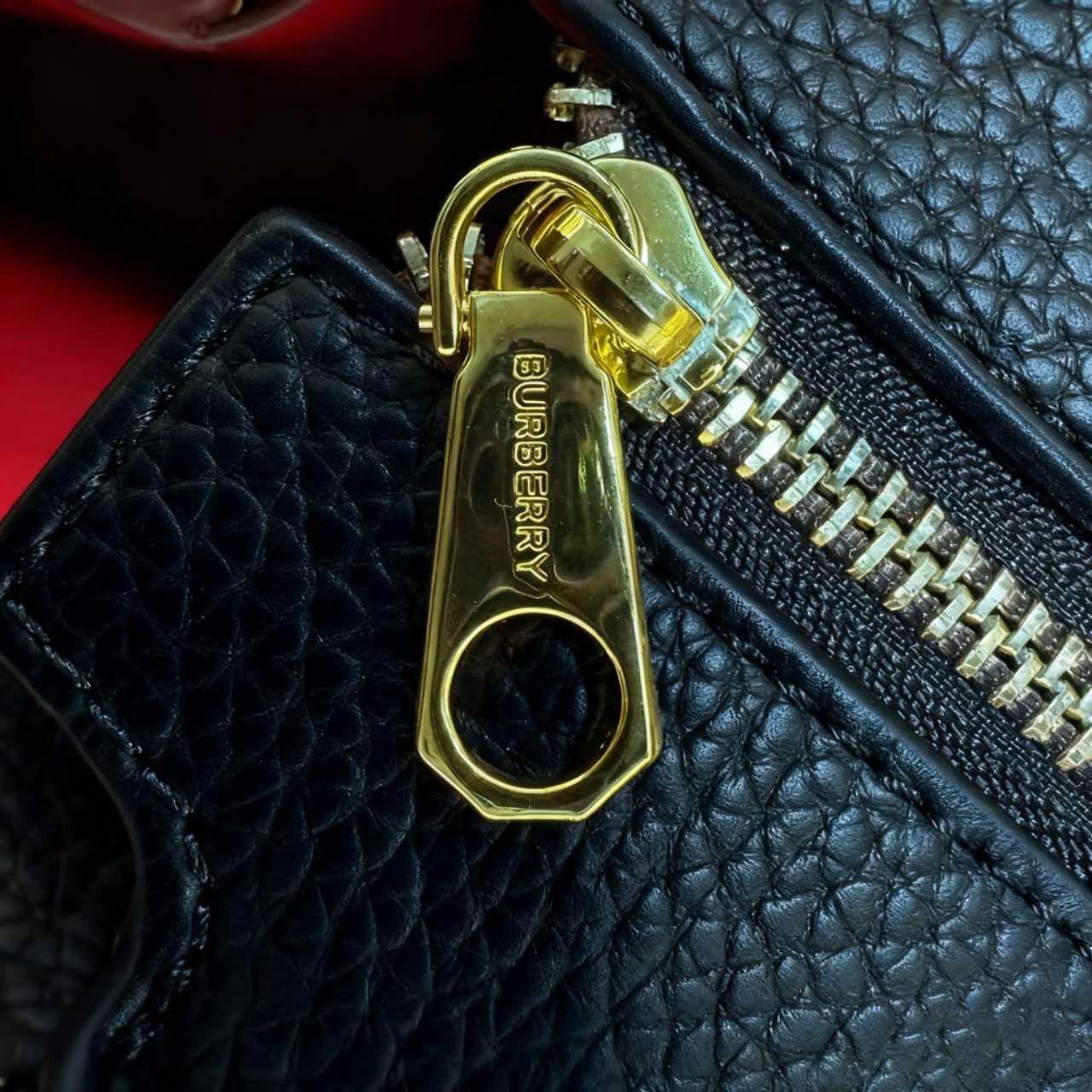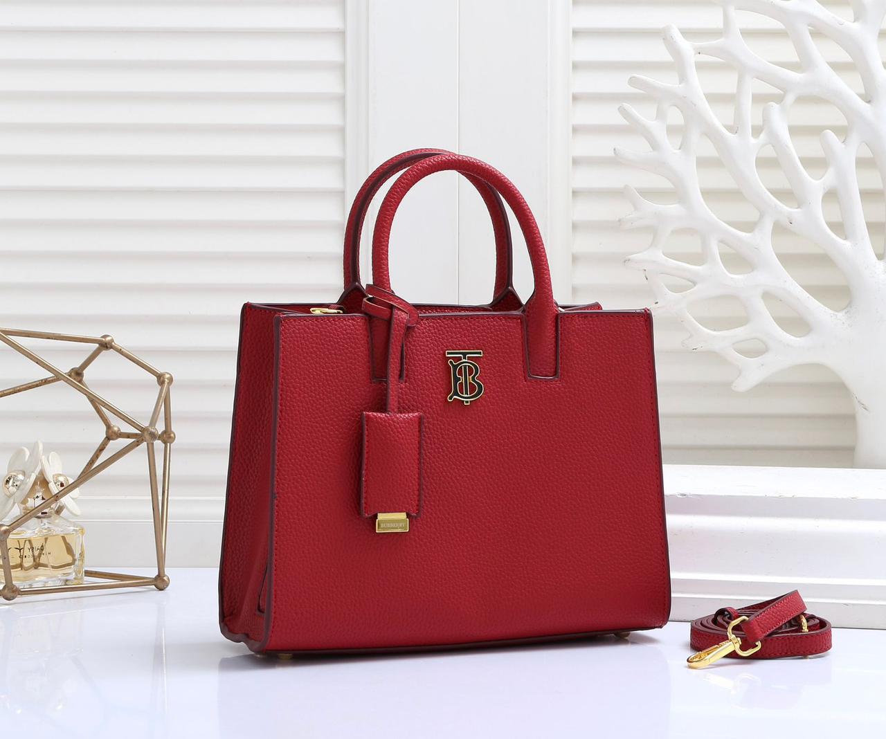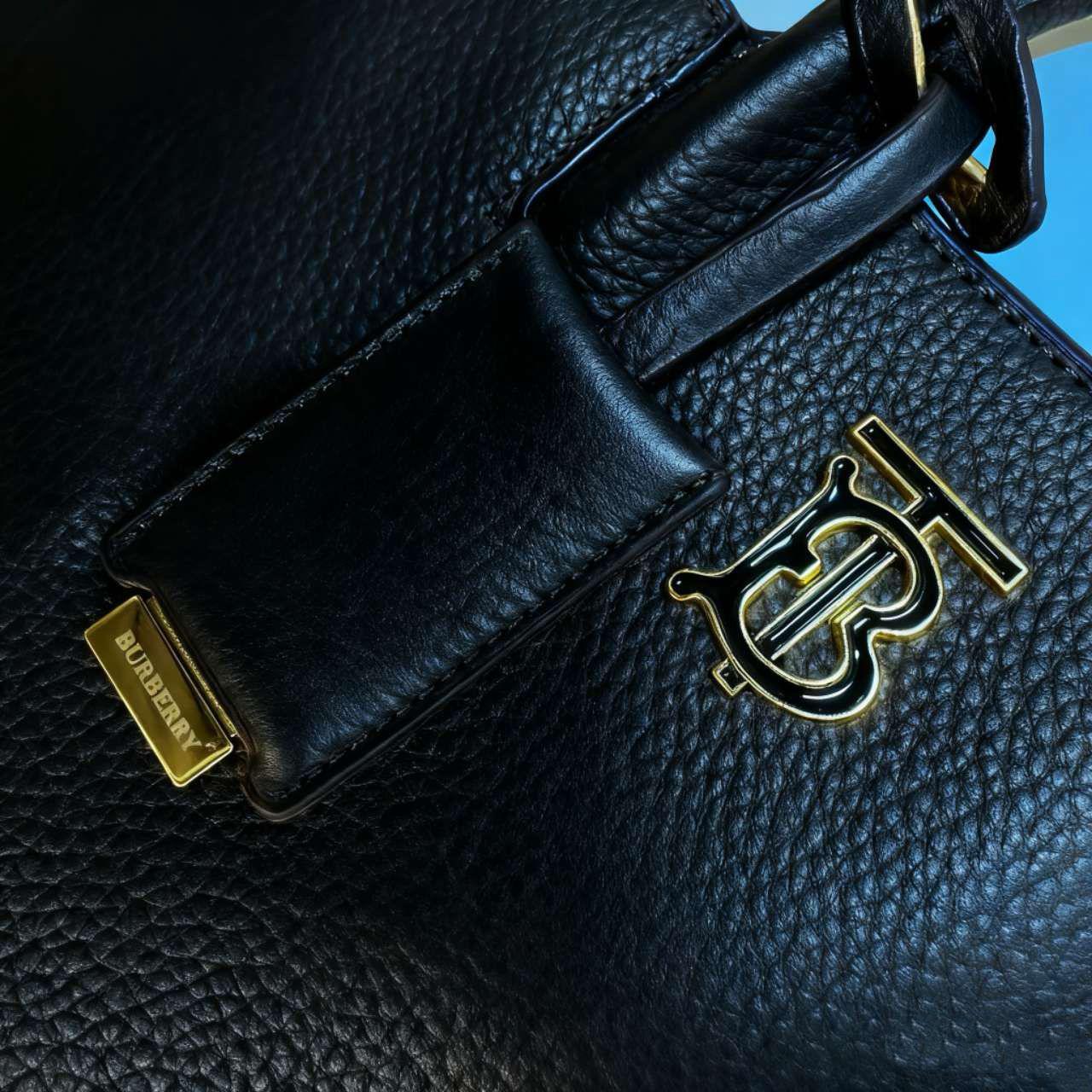 A classic structured Burberry-style tote bag with clean lines, rigid top handles, and a detachable strap. Crafted from textured leather in rich colors like green, black, and red, it is distinguished by the subtle gold-toned Thomas Burberry 'TB' monogram badge at the top center.