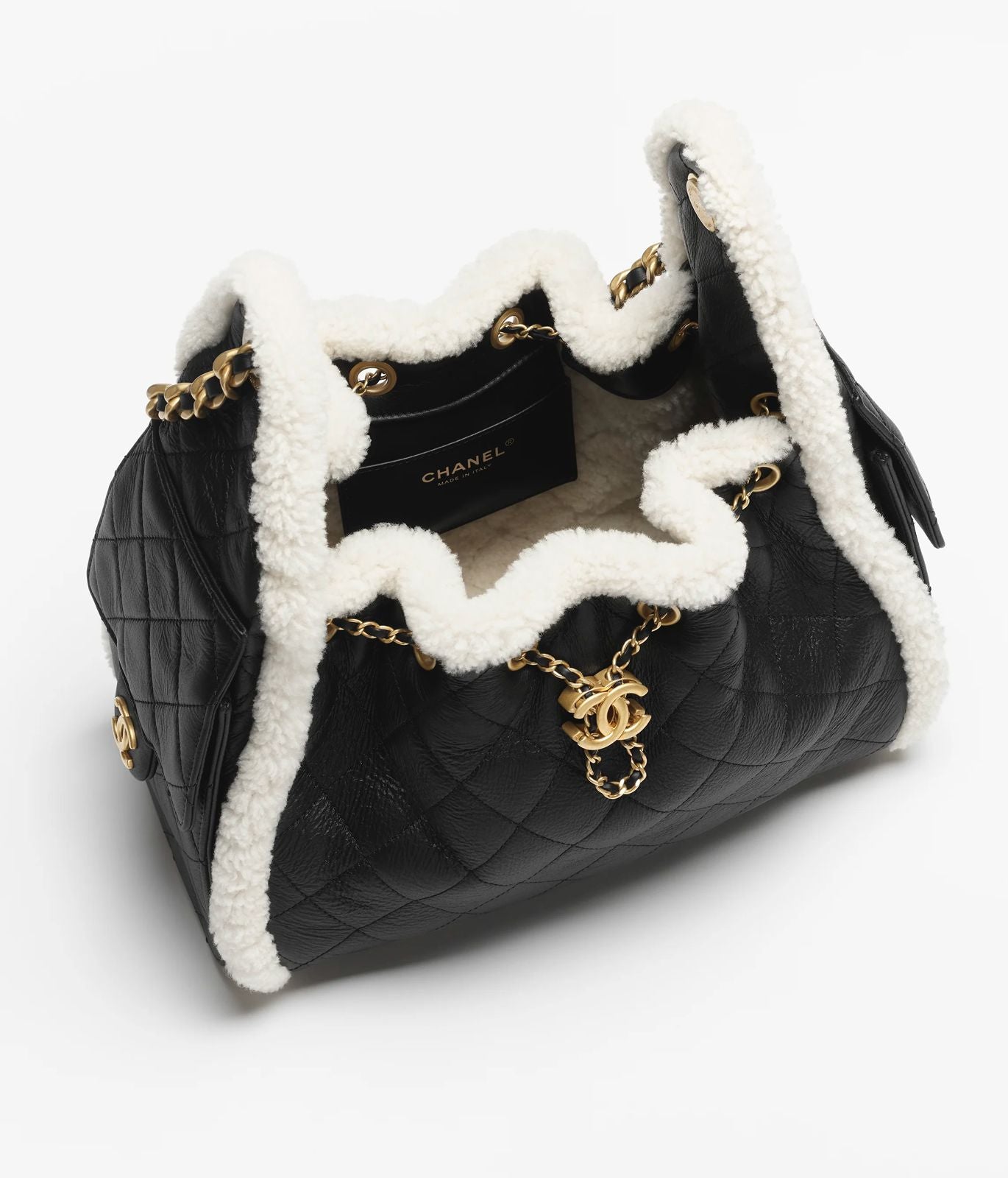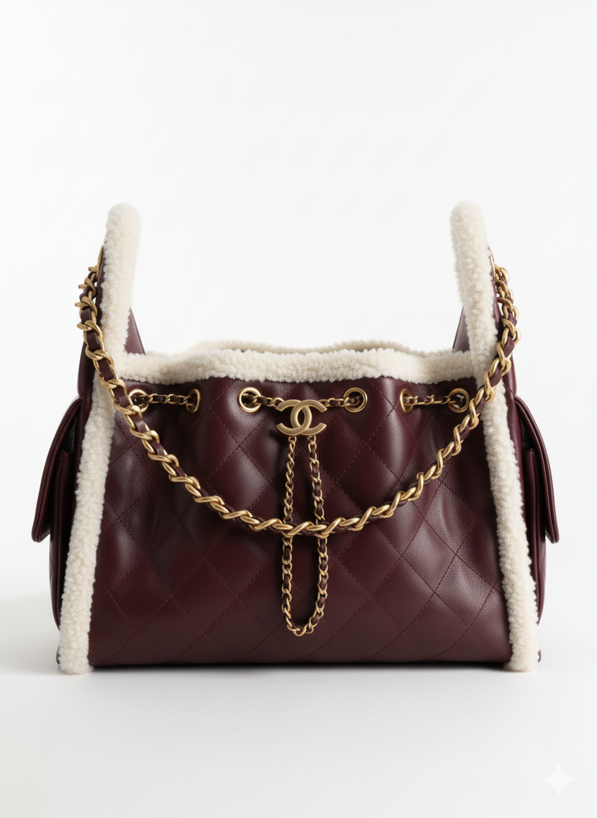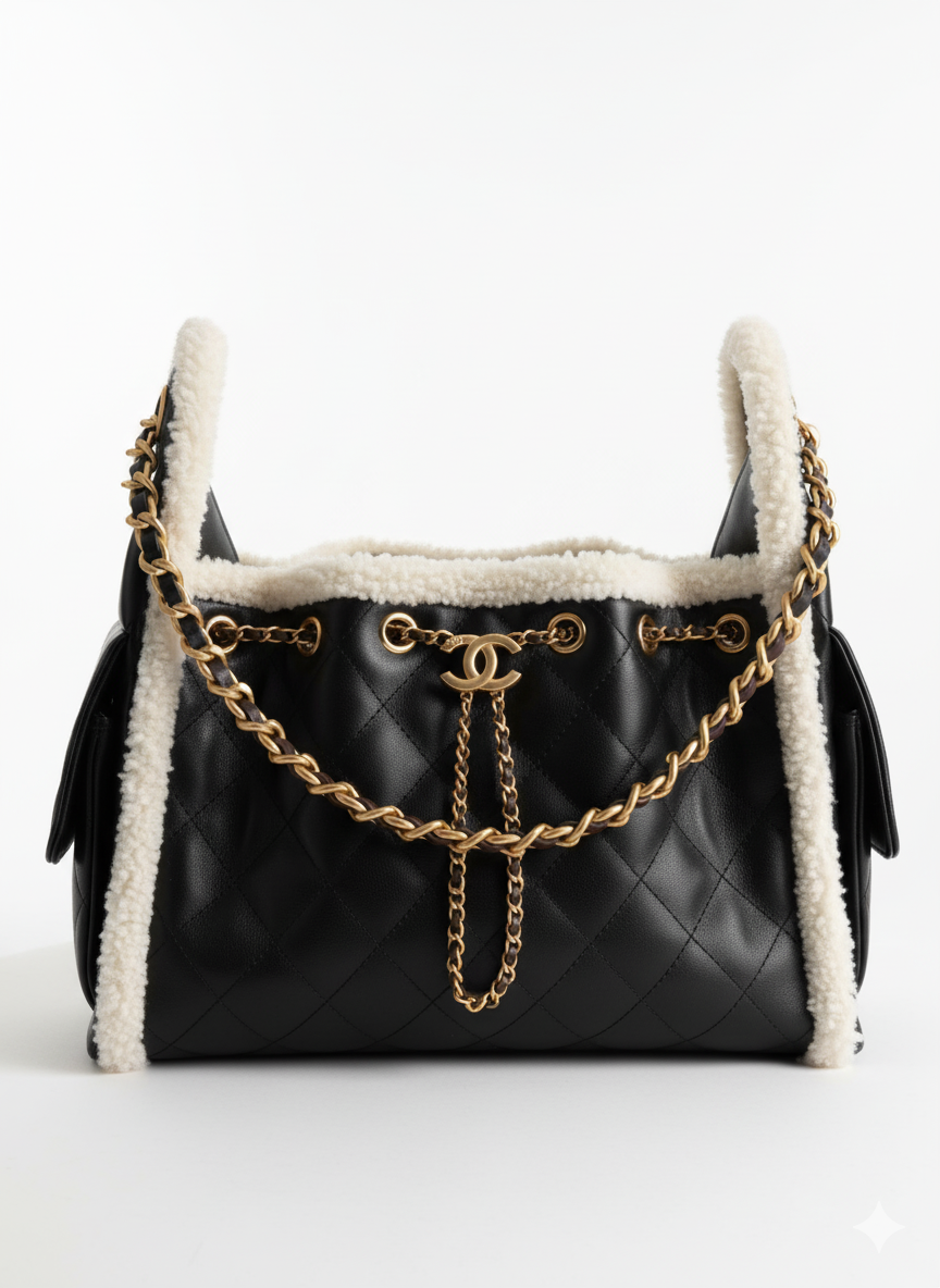 Iconic Contrast: The classic diamond quilting and gold chain details are framed by plush, soft trim, creating a striking and unforgettable accessory.