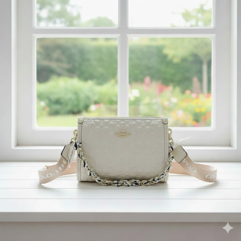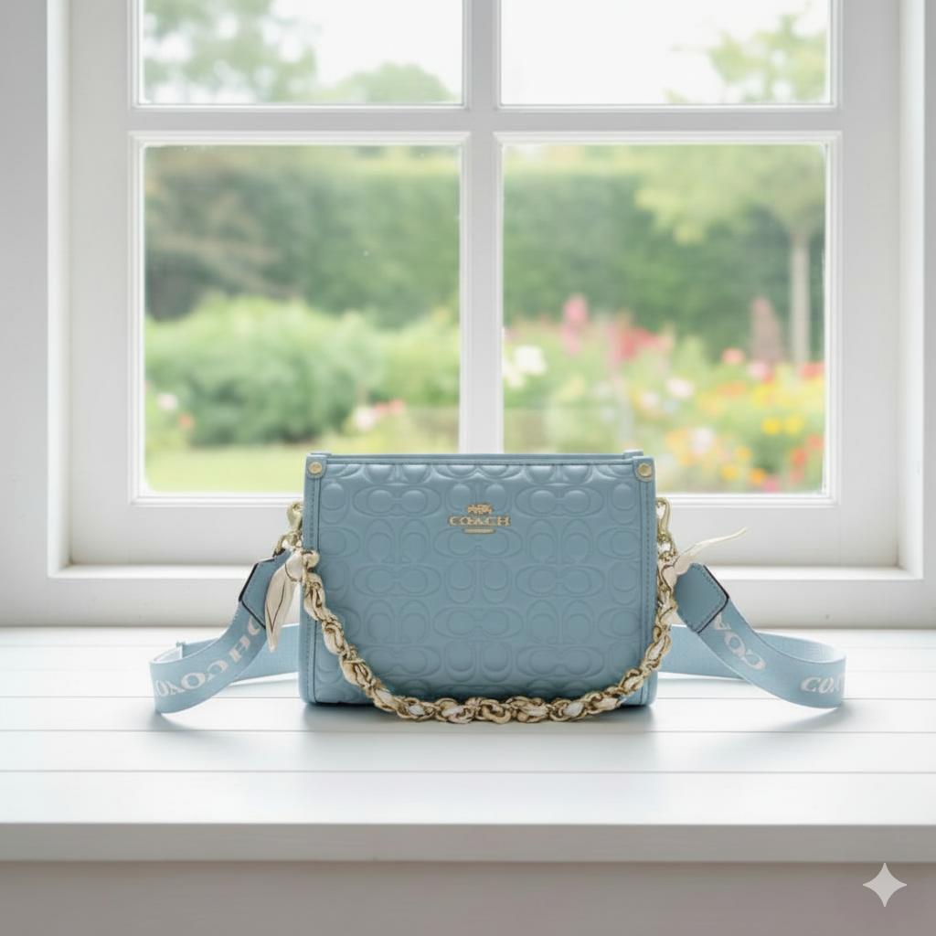 This compact Coach crossbody bag features a structured, rectangular silhouette and an all-over embossed monogram pattern. It is finished with a large, chunky gold-toned chain handle detail and a separate leather shoulder strap for versatile wear. Available in a stylish range of colors: Beige /White, Pink, Black, and Ice Blue.