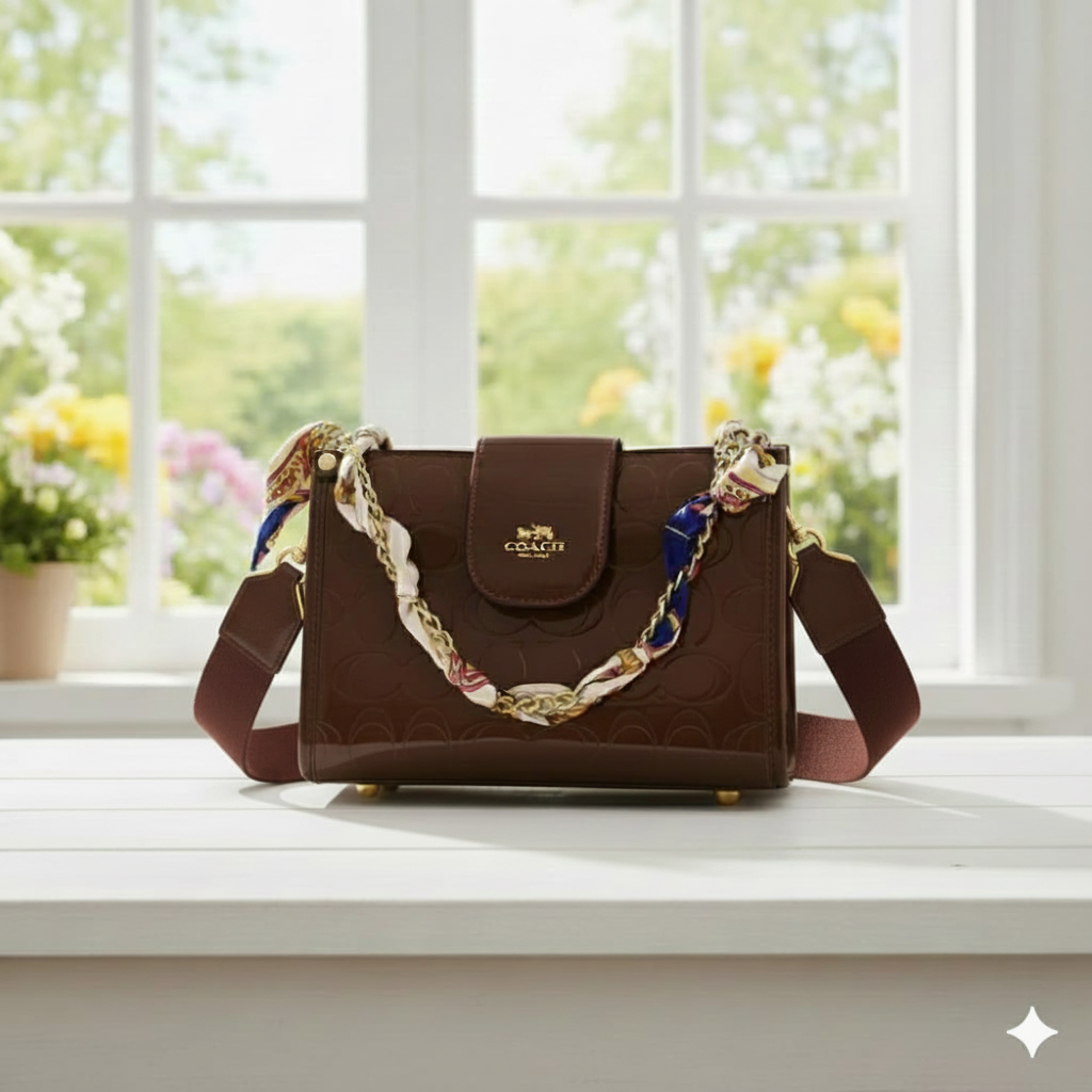 featuring an elegant embossed monogram pattern. This structured shoulder bag is highlighted by a chunky gold-toned chain interwoven with a colorful scarf, and an adjustable,