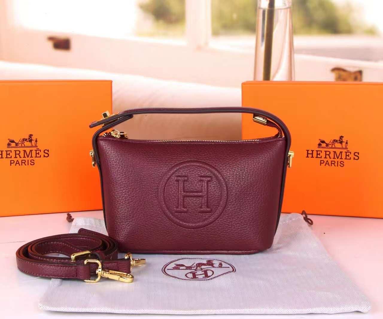 These are compact leather bags in the style of Hermès, featuring a prominent debossed "H" logo. Each bag comes with a zippered main compartment, a short top handle, and a detachable, adjustable shoulder strap. Available in black, bordeaux, and white, they are presented with Hermès-branded packaging.