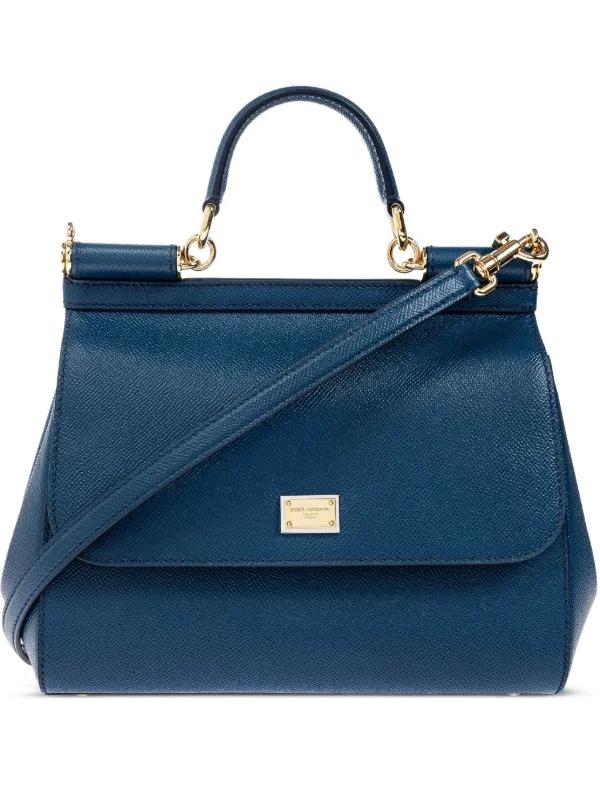 single top handle and a detachable, adjustable shoulder strap, both adorned with gold-toned hardware, including rings connecting the handle to the bag and a clasp on the strap. The bag has a distinct flap closure on the front, centered with a small, rectangular gold-toned plaque bearing the brand name "DOLCE & GABBANA." The material of the bag appears to have a textured, possibly Saffiano leather finish. The overall design is classic and elegant.