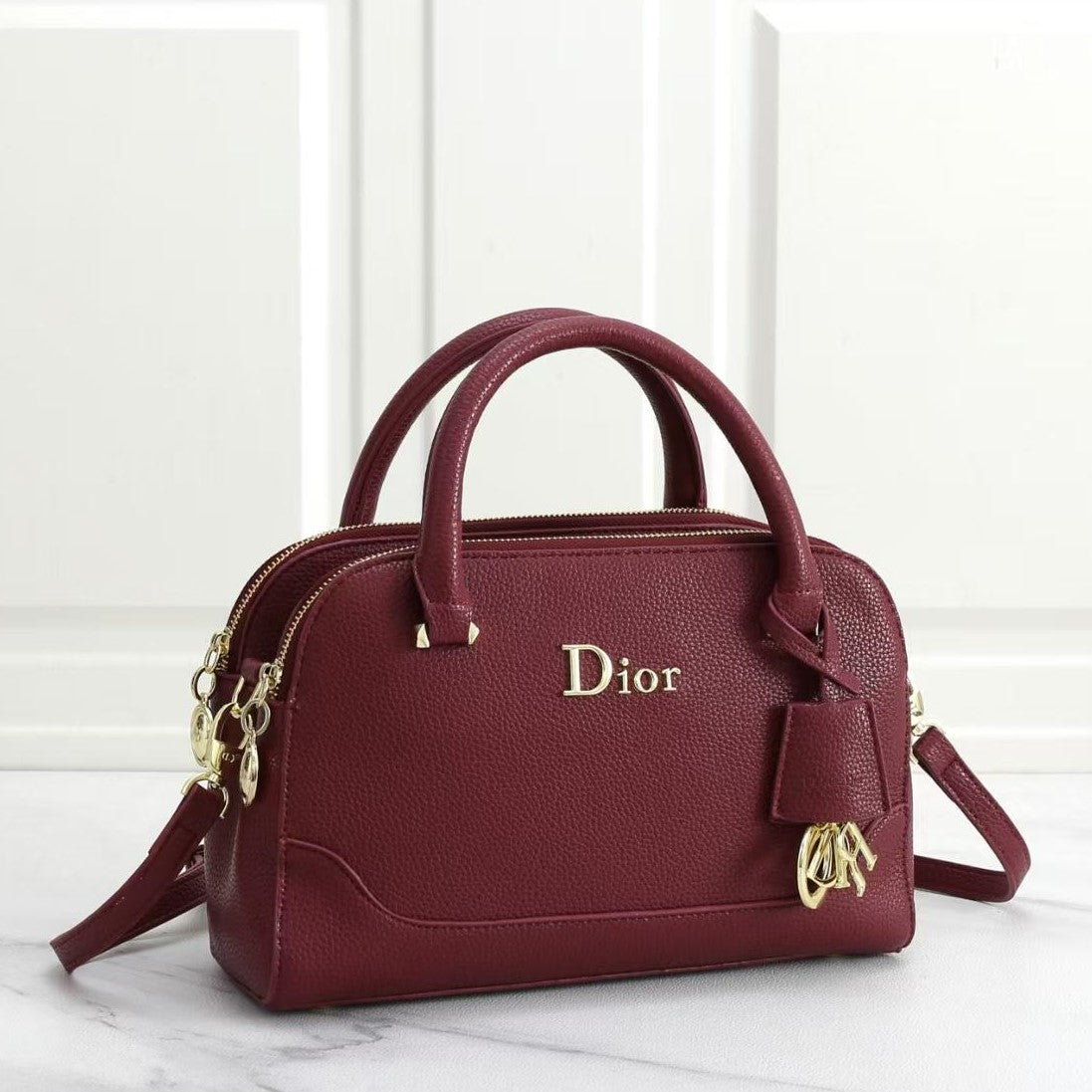 This is a small to medium-sized handbag with a structured, rounded silhouette. It features two top handles and a detachable shoulder strap, allowing for versatile carrying. The front of the bag prominently displays the "DIOR" logo in gold-toned hardware, along with a decorative charm featuring the interlocking "CD" initials. The bag has a top zipper closure.