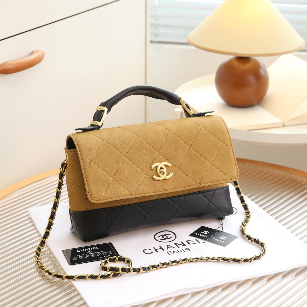 It is accented with a gold-tone Chanel logo on the front, a short top handle, and a versatile gold chain shoulder strap interwoven with black leather. Available in several upper-flap colors including black, brown, deep red/burgundy, light tan/camel, and golden yellow/mustard.