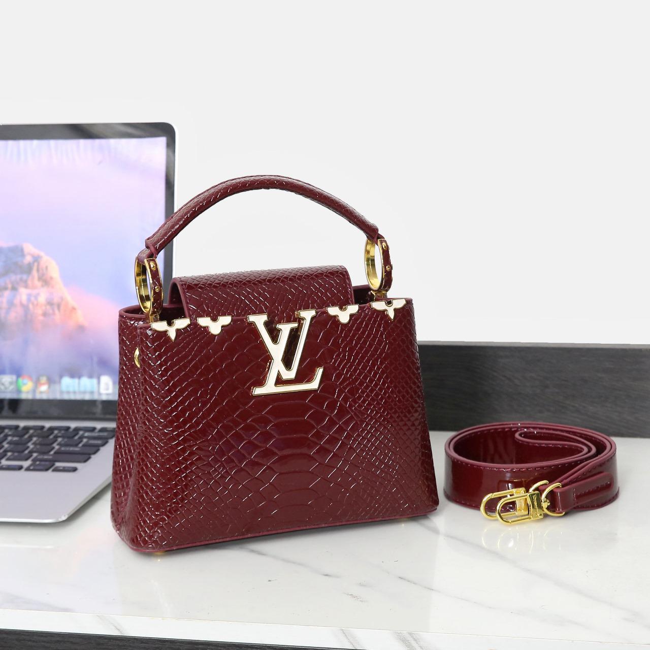 LV Capucines Style (Black Python)A chic, structured black top-handle bag with an embossed python texture, defined by the iconic gold-toned 'V' logo on the flap and a unique dotted metal trim along the top edge.LV Capucines Style (Silver Python)A futuristic and bold mini-bag featuring a metallic silver python-embossed finish, structured top handle, and the prominent gold-toned 'V' logo hardware.LV Capucines Style (White Python)An elegant and clean white mini-bag with an embossed crocodile/python texture, structured silhouette, and the signature gold-toned 'V' logo hardware on the flap.LV Capucines Style (Red Python)A stunning mini-bag in a deep, glossy burgundy/maroon python-embossed finish, featuring a rigid top handle and the classic gold-toned 'V' logo hardware.