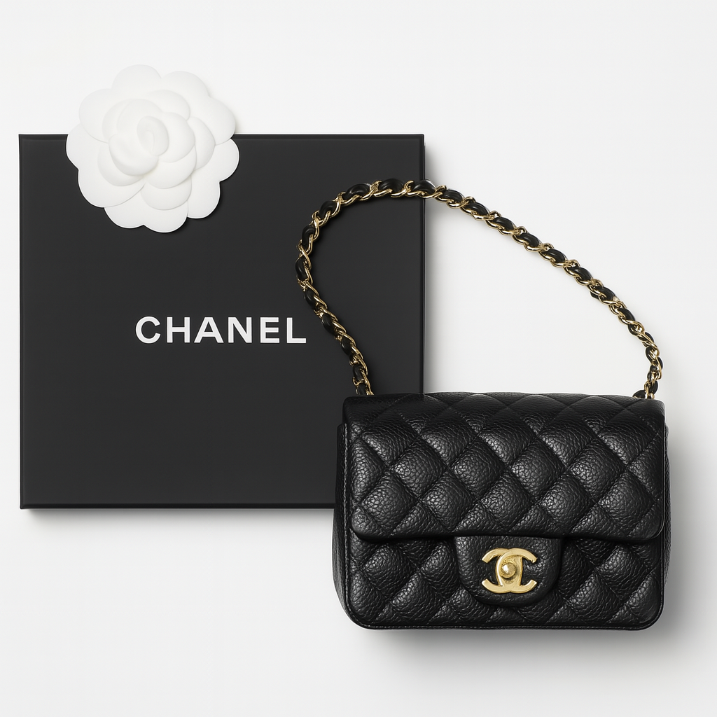 Add a timeless touch to your look with this Chanel Mini Classic Flap Bag. Crafted from luxurious caviar leather with signature diamond quilting and a gold-tone CC turn-lock. Perfect for day or night elegance.