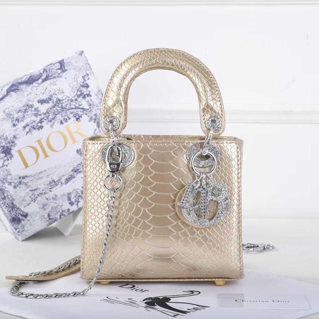 The Mini Lady Dior bag, crafted with a distinctive python-effect texture, offers a luxurious tactile experience. It features sparkling, crystal-embellished D.I.O.R. charms and a delicate chain strap, making it a truly glamorous accessory.