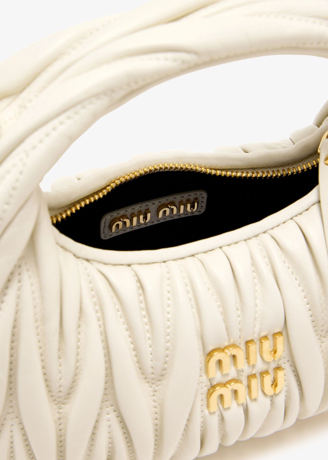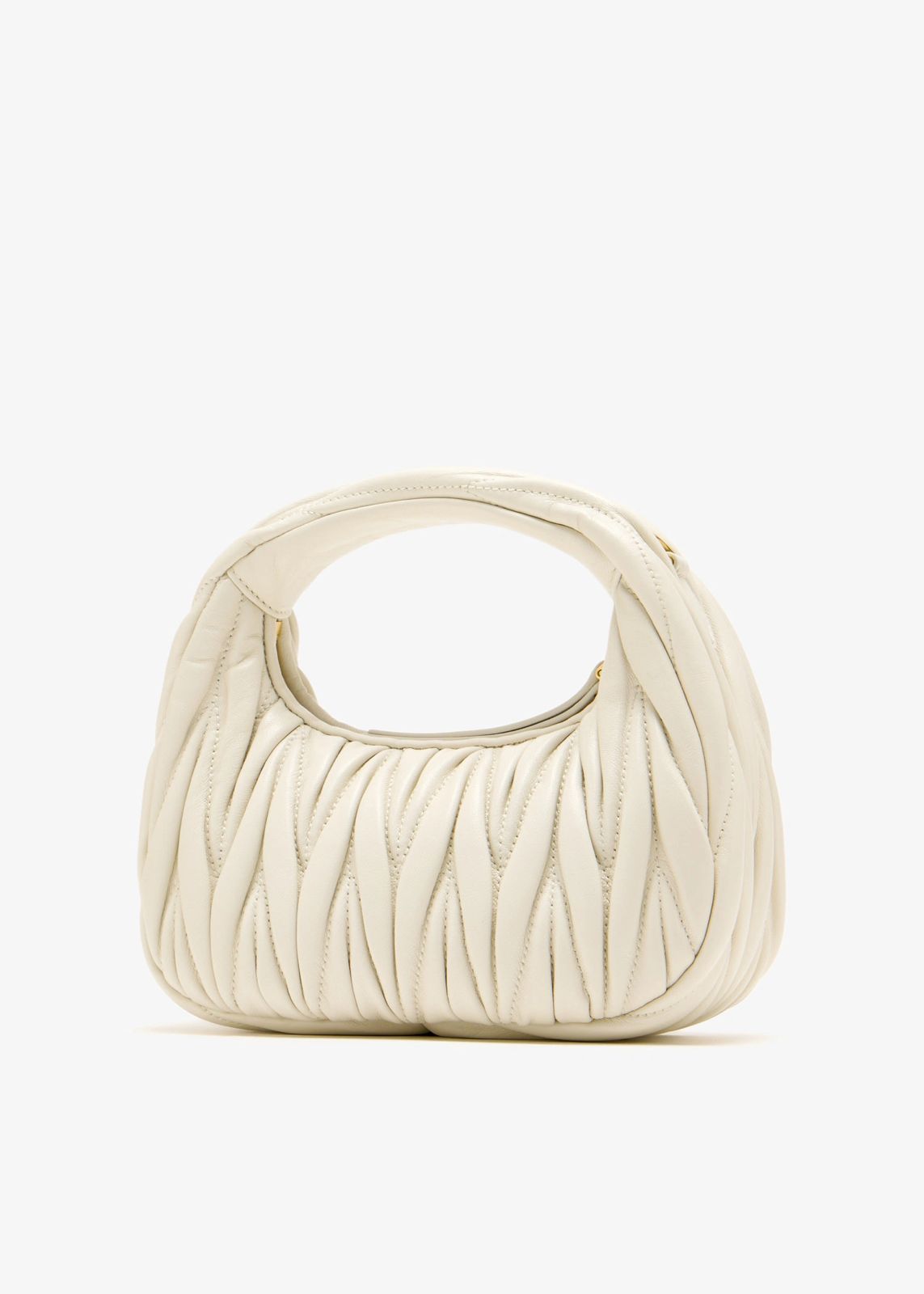 A chic, compact hobo shoulder bag in soft white or cream leather. It features a puffy, tactile surface created by a distinctive vertical chevron quilting pattern, an integrated shoulder handle, and the MIU MIU logo prominently displayed in gold-tone lettering on the front.