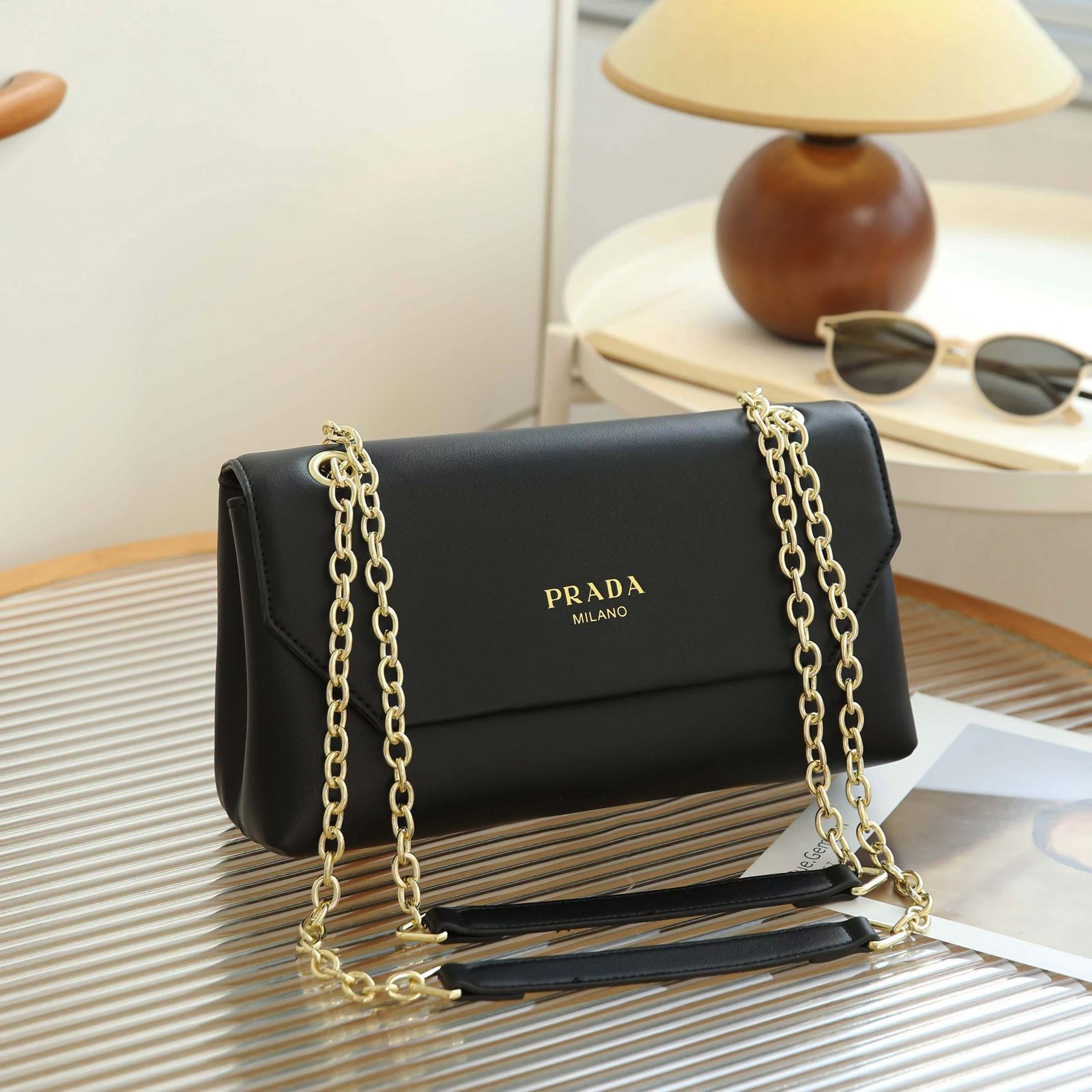 The Prada "MILANO" logo is stamped in gold on the center of the flap. The chain strap is thick and has a leather section in the middle for a comfortable shoulder grip