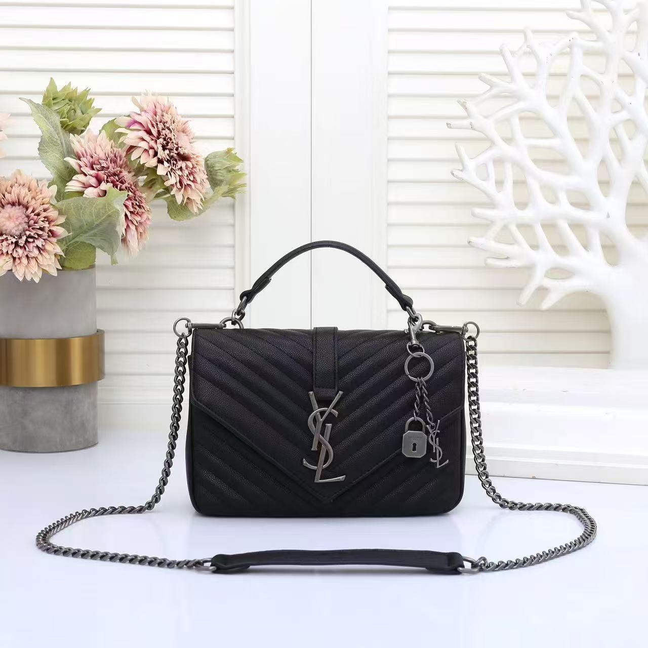 flap bag from Yves Saint Laurent. The bag has a prominent chevron-style quilted pattern on its textured surface. It features a top handle and a long, detachable, silver-toned chain strap with a black leather section for comfort. The iconic, interlocking "YSL" logo is on the front, along with a decorative lock and key charm.